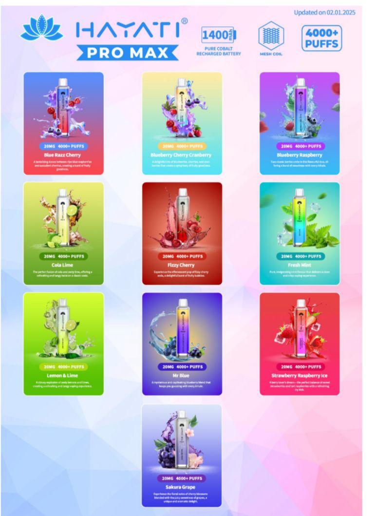 Packed with 10ml of premium 20MG (2%) nicotine salt e-liquid, this disposable vape offers a lasting 4000+ puff capacity and is powered by a 1400mAh rechargeable battery. Whether you’re on the move, socializing, or unwinding, the HAYATI Pro Max guarantees reliable performance, convenience, and incredible taste with every draw.